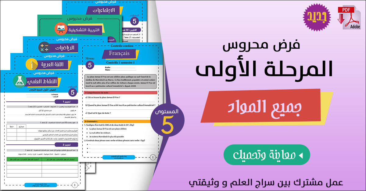 نماذج من المراقبات المستمرة الخاصة بالمرحلة الأولى أي نماذج من الفرض الأول للدورة الأولى (الفروض 1 للدورة 1) للمستوى الخامس